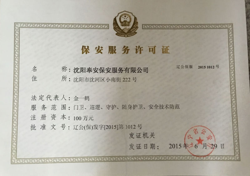 沈陽奉安保安服務(wù)有限公司(原沈陽市沈河區(qū)保安服務(wù)公司)創(chuàng)建于一九八八年八月,是遼寧省公安廳、沈陽市公安局批準(zhǔn),工商行政部門登記注冊,全市首家具備保安資質(zhì)的特殊性服務(wù)企業(yè),隸屬于沈陽市沈河區(qū)政府直管的全民國有企業(yè),現(xiàn)為中國保安協(xié)會會員單位和省保協(xié)、市保協(xié)常務(wù)理事單位:在全市同行業(yè)中率先通過ISO國際質(zhì)量認證,是市工商局批準(zhǔn)的“重合同守信用”免檢單位和沈陽市政府采購中心保安服務(wù)項目重點競標(biāo)單位;擁有一支專業(yè)化、標(biāo)準(zhǔn)化、職業(yè)化的高素質(zhì)保安隊伍,是公安機關(guān)重要的輔警力量。